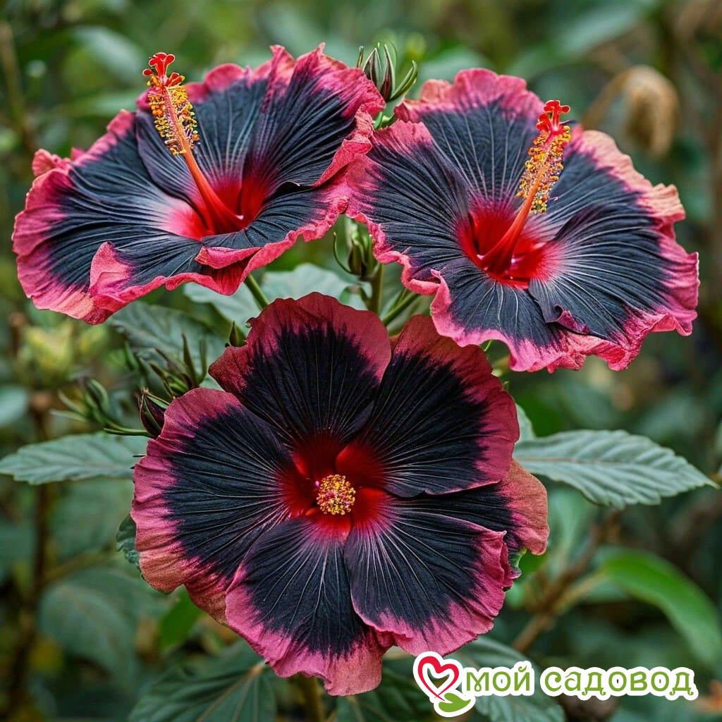 Садовый гибискус «Файер Дэнсер» — это настоящее произведение искусства, которое не оставит равнодушным ни одного ценителя прекрасного. Его крупные, почти чёрные цветки с огненно-красной каймой, словно языки пламени, притягивают взгляд и создают атмосферу загадочности и страсти. Представьте, как этот прекрасный гибискус будет смотреться в вашем саду на фоне зелени, словно таинственный цветок из сказочной страны!