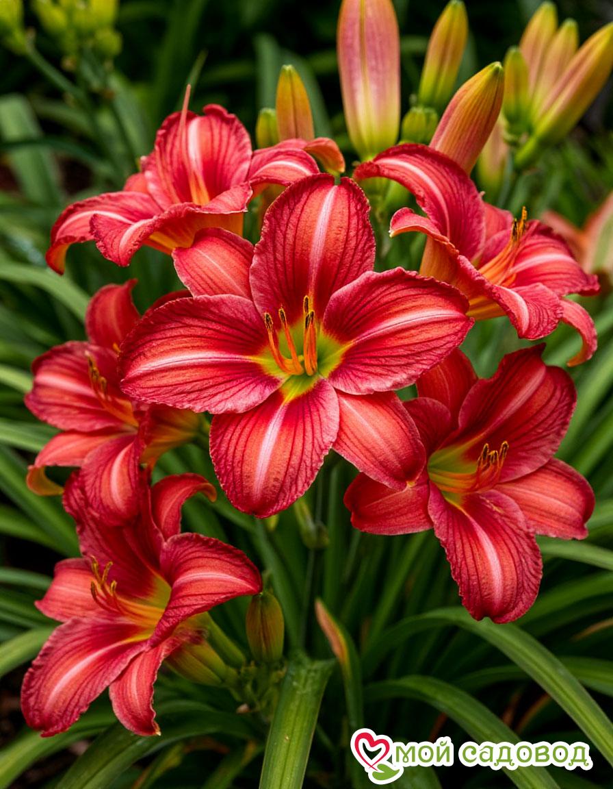 Лилейник (Hemerocallis) — многолетнее травянистое растение, принадлежащее к семейству Ксанторреевые (Xanthorrhoeaceae), хотя в некоторых классификациях его относят к семейству Асфоделовые (Asphodelaceae) или Лилейниковые (Hemerocallidaceae). Его название происходит от греческих слов «hemera» (день) и «kallos» (красота), что отражает основную особенность цветения лилейников: каждый цветок распускается всего на один день. Однако благодаря множеству бутонов на цветоносе цветение одного куста может продолжаться от нескольких недель до нескольких месяцев. Внешний вид и строение: Лилейник представляет собой травянистое растение с корневой системой, состоящей из мощных мясистых корней, служащих для запасания воды и питательных веществ. От этих корней отходят многочисленные пучкообразные линейные или мечевидные листья, образующие прикорневую розетку. Листья, как правило, ярко-зелёные, но у некоторых сортов могут быть сизоватыми или иметь другие оттенки. Они могут быть как узкими, так и широкими, в зависимости от сорта. Высота куста варьируется от карликовых сортов (20-30 см) до высокорослых (100 см и более), что также зависит от сорта. Цветоносы лилейников, как правило, безлистные, прямостоячие и возвышаются над листьями. На верхушке цветоноса формируется несколько бутонов, которые раскрываются по очереди, обеспечивая продолжительное цветение. Цветки лилейников разнообразны по форме, размеру и окраске. Они могут быть простыми (6 лепестков), махровыми (с увеличенным количеством лепестков) или полумахровыми. Форма цветков варьируется от воронковидной до звёздчатой, паукообразной или круглой. Диаметр цветков может варьироваться от 5 до 25 см и более. Окраска цветков лилейников поражает своим разнообразием: от нежно-кремовых и пастельных тонов до ярких красных, оранжевых, желтых, фиолетовых и даже почти черных. Часто встречаются двухцветные и многоцветные сорта с контрастными краями, полосками, глазками (окрашенное пятно в центре цветка) и другими узорами. Лилейники неприхотливы и хорошо растут практически в любых условиях. Они предпочитают солнечные места, но могут переносить и полутень, особенно в жарком климате. Почва должна быть плодородной, хорошо дренированной, с нейтральной или слабокислой реакцией. Уход за лилейниками включает в себя: Полив: регулярный полив в сухую погоду, особенно в период активного роста и цветения. Подкормка: весенняя подкормка комплексным минеральным удобрением для многолетних растений, повторная подкормка после цветения для поддержания здоровья растения. Мульчирование: Мульчирование почвы вокруг кустов помогает сохранить влагу, подавить рост сорняков и защитить корни от перегрева. Обрезка: удаление отцветших цветоносов для поддержания декоративности и стимулирования повторного цветения (у повторноцветущих сортов). Осенью обрезают отмершую листву. Деление кустов: Регулярное деление кустов (каждые 3-5 лет) способствует омоложению растений и сохранению сортовых признаков. Деление проводят весной или осенью. Защита от вредителей и болезней: Лилейники относительно устойчивы к вредителям и болезням, но иногда могут поражаться слизнями, тлей или ржавчиной. При необходимости применяют соответствующие меры защиты. Использование в ландшафтном дизайне: Лилейники широко используются в ландшафтном дизайне благодаря своей неприхотливо