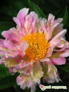 Полумахровый. Цветок большой, симметричный, розово-лавандовый с маленьким центром из золотисто-жёлтых тычинок. Лепестки с серебристыми краями. Аромат лёгкий. Цветение обильное, в полном роспуске за цветами не видно листвы. Высота 65-70 см. Стебли крепкие. Листва густая, тёмно-зелёная. Срок цветения средний. Отличный ландшафтный пион. Место посадки Для посадки пионов понадобится защищенное от ветров место с хорошей освещенностью. Сорта светлой окраски, а также пионы с простыми и полумахровыми цветками можно посадить на частично затеняемом участке, это продлит цветение и защитит цветы от выгорания. Почва для посадки Залог успешного цветения пиона в будущем — это подготовка почвы! 1. Подготовка ямы — 70*70 см на скудных песчанистых и торфянистых почвах — 50*50 см на плодородных, окультуренных почвах. ХРАНЕНИЕ ДО ПОСАДКИ: После получения посылки, рекомендуем вскрыть пакет и осмотреть корневище. Почки должны быть плотные и розового цвета. Так же уделите внимание самому корневищу, все сомнительные, потемневшие, сморщенные части удалите, а места среза обработайте зеленкой или залой. Если почки еще не тронулись в рост, а высаживать в открытый почву рано, советуем Вам хранить корневище в холодильнике, обязательно оставляя его в пакете с торфяной смесью или в коробке под снегом. Если почки успели раскрыться это не критично, сохранить до посадки их так же возможно, высадите корень пиона в большой просторный горшок или в любую другую ёмкость.