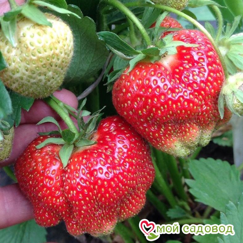 Ягоды крупноплодной клубники Виктории имеют крупный размер ягод. Техническая спелость наступает, когда ягоды приобретают ярко-красный окрас, но со временем он темнеет. Желтоватые семена средне углублены. Мякоть окрашена в розовый цвет, плотная, средней сочности. У неё приятный запах земляники средней интенсивности. Вкус этой клубники гармоничный, кисло-сладкий. Сорт формирует мощные кусты, пускающие многочисленные усы. Листья имеют крупные размеры и окрашены в интенсивный зелёный цвет. Цветоносы не отличаются силой и припадают под тяжестью плодов к земле. Посадка и уход за клубникой Посадка: осенью (с середины августа до середины октября) и ранней весной Освещение: яркий солнечный свет Почва: легкая – суглинок, супесь, чернозем или лесные, богатые органикой грунты с водородным показателем pH 5,7-6,2 Полив: утренний, с конца апреля – один раз в 10-12 дней, расходуя на каждый м² участка 10-12 л воды Подкормки: минимум три раза в год: ранней весной, в период бутонизации и в августе Обрезка: когда листья начнут желтеть, покрываться пятнами и сохнуть, их обрезают Размножение: усами (розетками), делением куста